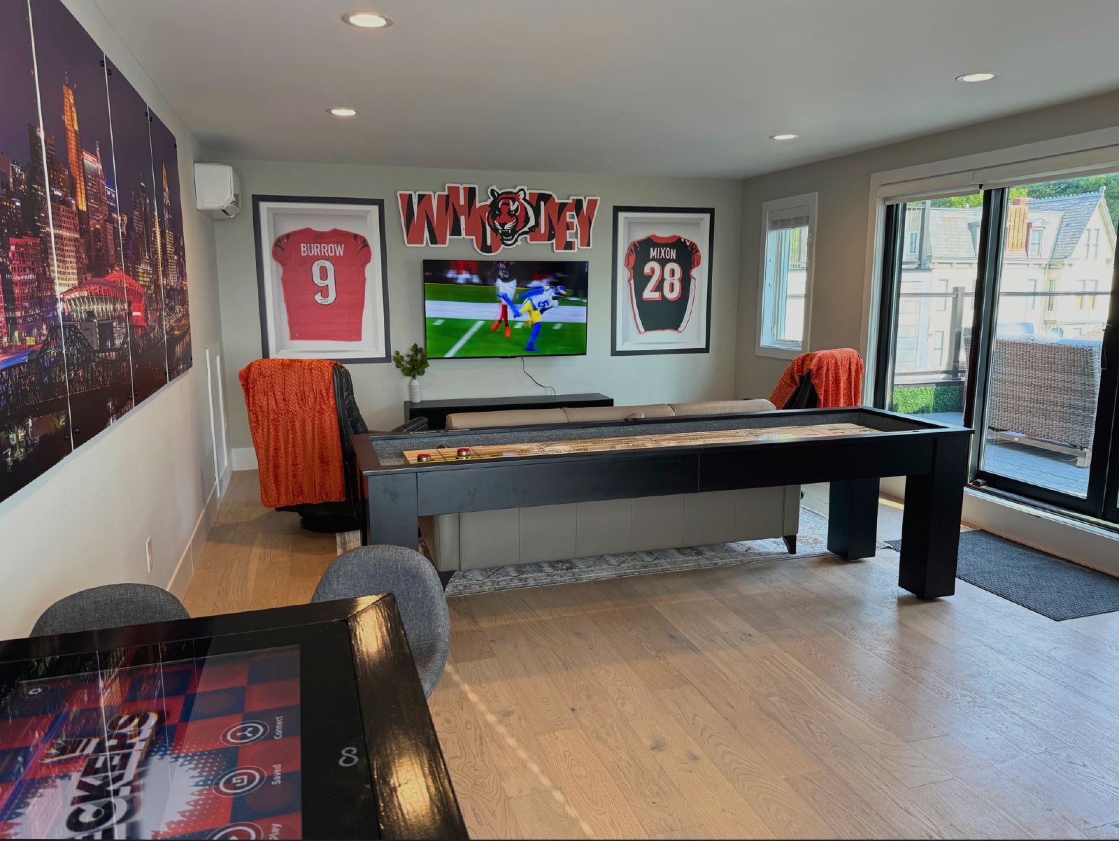 Beuatiful luxurious contemporary home with River views. This home has all the bells and whistles and can sleep up to 12. It is completely furnished and has a fully stocked kitchen for you chefs. With walk out decks from the 1st and 3rd floors you will sure enjoy the beutatiful river views and relax in the Cincinnati sun. The house also has a "game room" on the 4th floor that is stocked with a shuffleboard table, an Infinite Game table with up to 48 electronic board games. The downstairs bedroom also has a Play Station Video game consel.