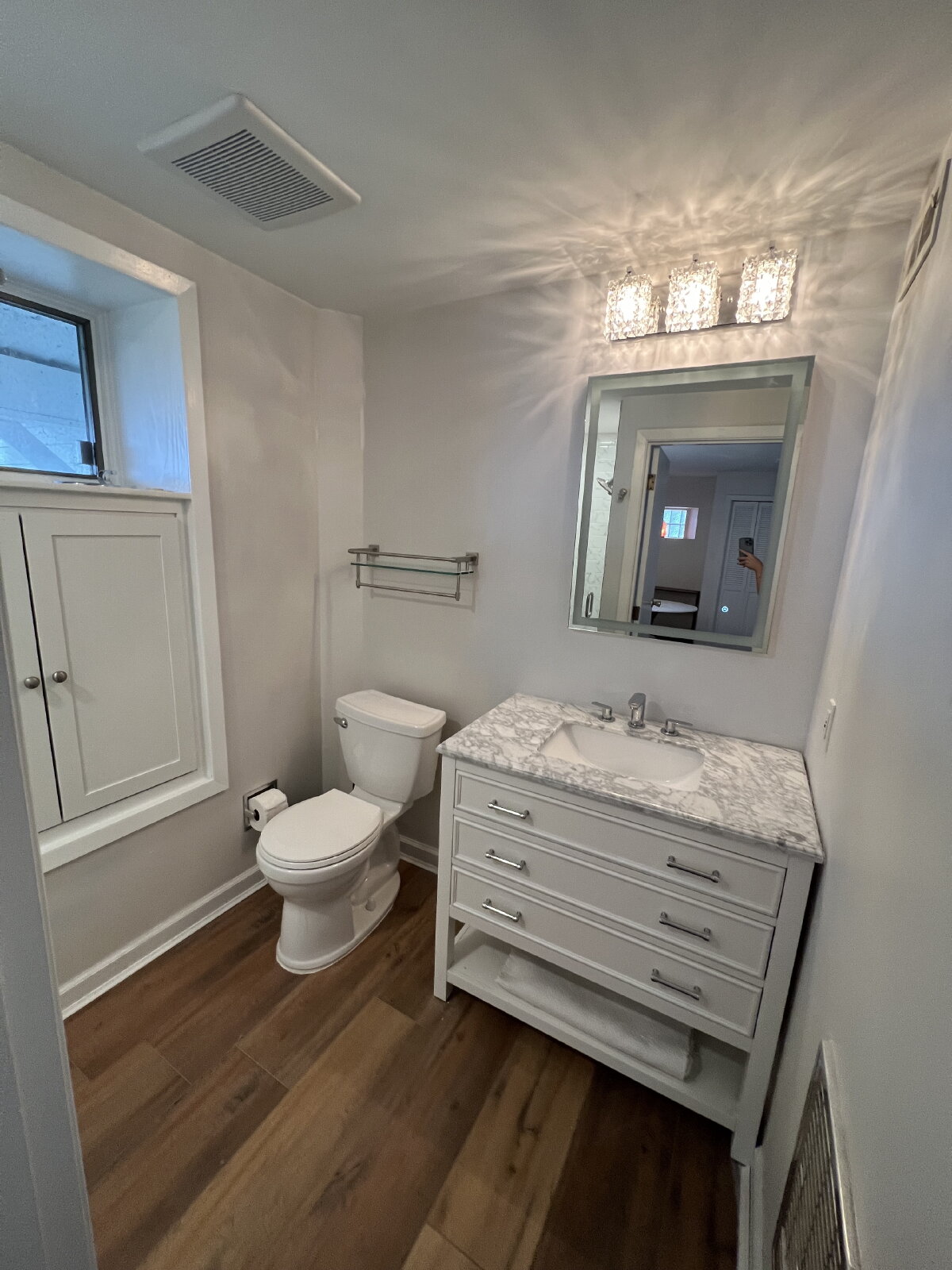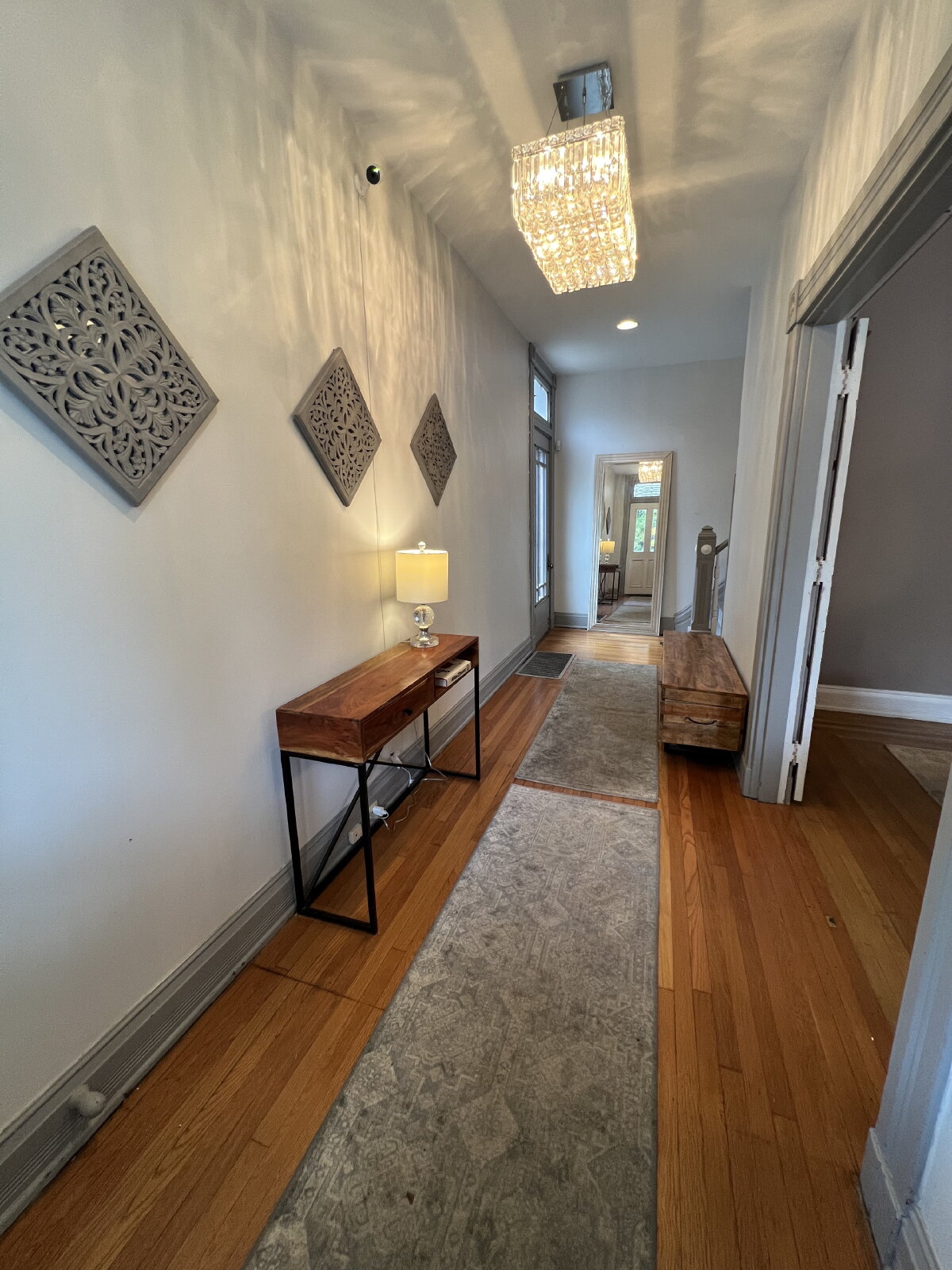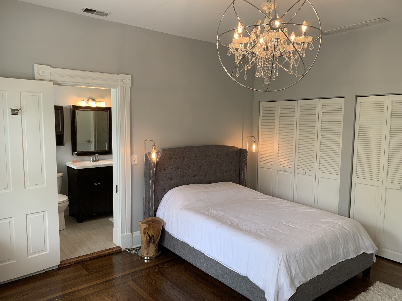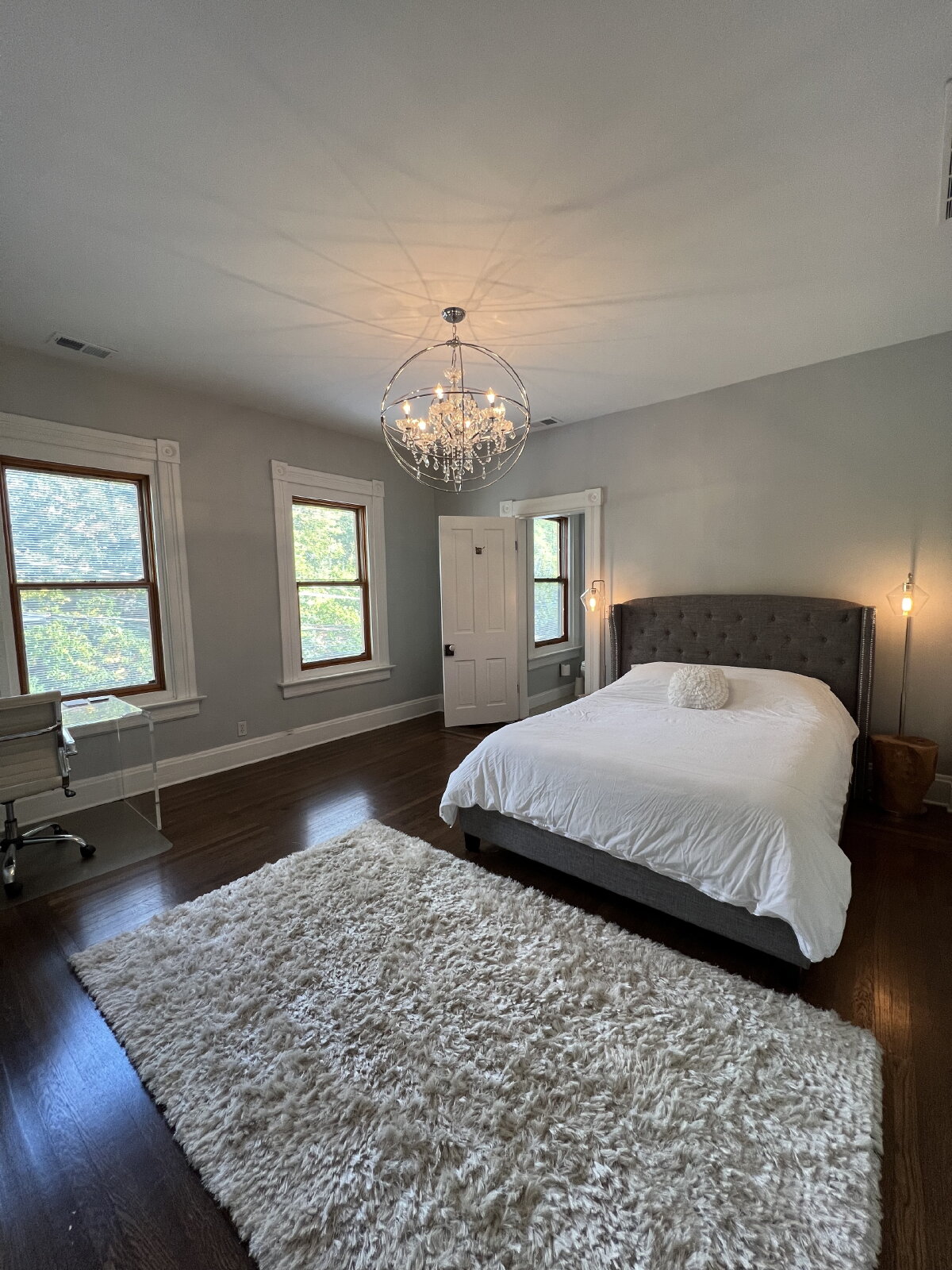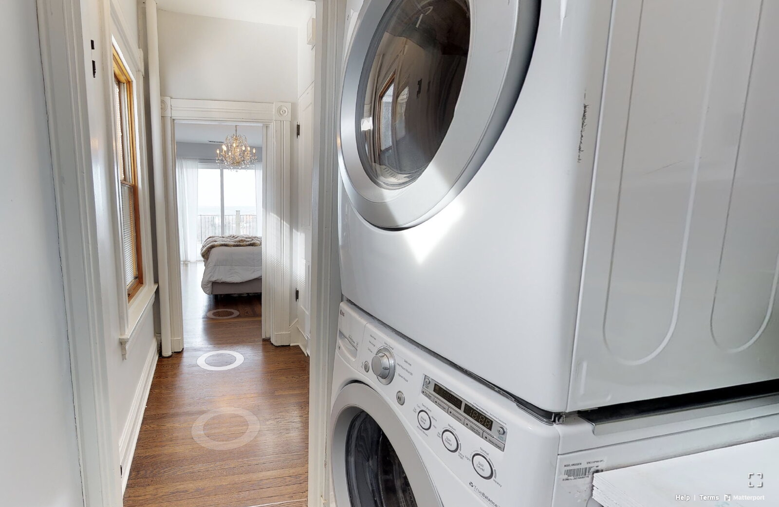 the heat and AC on the top two floors, for efficiency), upstairs front-loading washer/dryer and laundry room, a motorized drawer-style microwave, a wine refrigerator, and a renter-controlled Ring doorbell, for peace of mind. Many of the elegant and unusual light fixtures throughout the house have smart switches that look and work like regular, manual dimmer switches, but which can also be controlled via smartphone, or with voice commands to Alexa or Google Assistant. Large walk-in master bedroom closet, and ample storage throughout.