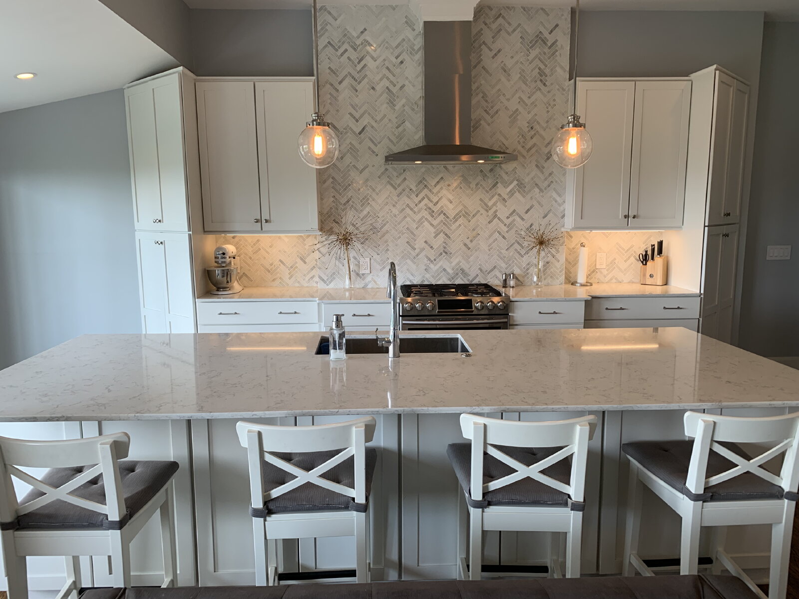 morning coffee in a chic, modern kitchen, with an oversized white marble island